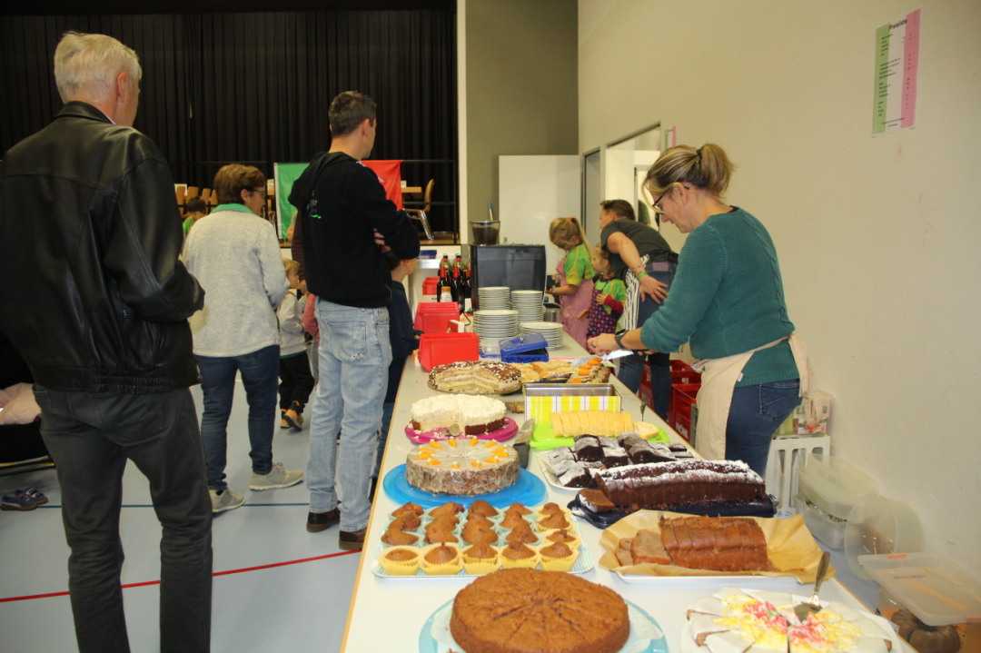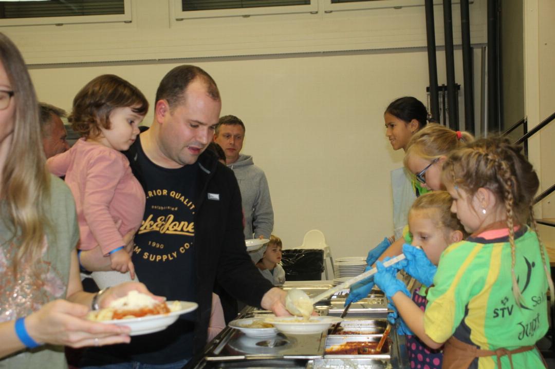 Kinder vergnügten sich zwischendurch an der Sprossenwand, und immer wieder bewegte sich eine Schlange mit Tellern in der Hand in Richtung Schöpfstelle. Kinder von der Jugi sammelten gebrauchtes Geschirr ein. Mitglieder der ganzen Turnerfamilie unterstützten, wo nötig, beim ganzen Anlass. Das reichhaltige Dessertbuffet war mit Kuchen, Torten und Kleingebäck aus elterlichen Backstuben bestückt.