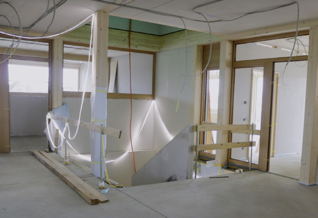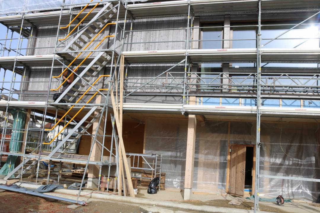 Der Neubau des Schulhauses «Brüggli» nimmt weiter Gestalt an: Zurzeit werden die Wandverkleidungen aus Holz getätigt und die Plattenarbeiten schreiten voran.